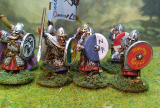 Consequently in the last two Friday sessions I've finished off a 12 figure shieldwall of Conqueror Model Dwarves. This is the third shield wall unit and has a blue raven banner. The banner delayed finishing the unit for a week as I searched for a raven design that I liked. I finally found one on Twitter, on the shield of a viking warrior painted by @PaintsPirate. I modified his design a bit, mostly by adding a ring in its beak, something I'd noticed in First Nations raven art. In First Nations iconography it's probably the Sun, but this being Middle Earth, it's a Ring.